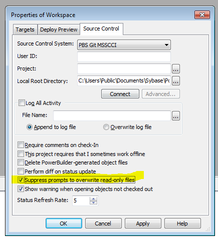15. Open the workspace properties and select PBS Git MSSCCI from the list of source control systems.