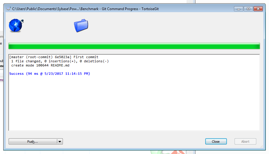 That takes the files that have been committed locally and updates the remote repository with them. You will be prompted for your GitHub username and password. You should see a summary dialog like this when you are done.