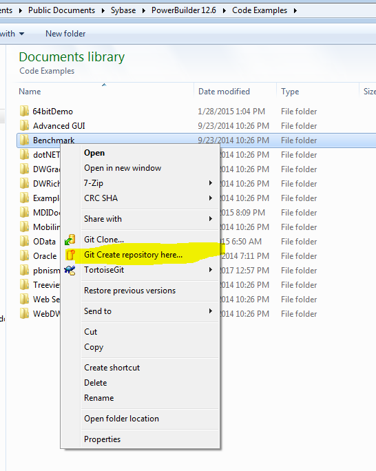 7. Find the parent directory of the PowerBuilder code that you want to start hosting in GitHub, Right click on that directory and select the "Git create repository here" option.