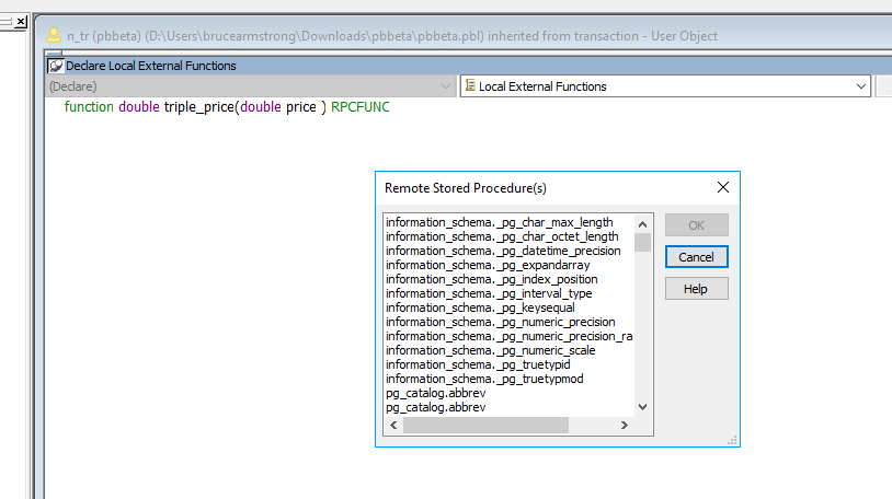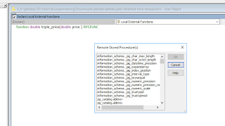 One thing you have to watch out for here is that PostgreSQL allows functions to be declared with arguments that have data types but not names. That triple_price function that I created as a local external function was pasted in that way, which caused a compile error when I saved the transaction object. The solution is simple: if there wasn't an argument name on the function in PostgreSQL, simply add one to the RPCFUNC declaration.