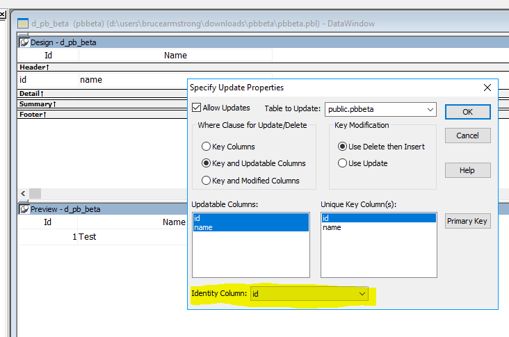 Two of the tables in that table list above aren't from the BookTown demo. Instead, they are tables I created in order to test out the identity column support for PostgreSQL from the PowerBuilder DataWindow. I'm happy to report that the DataWindow automatically picked up the identity column and handled the values for it correctly for both methods of declaring it.