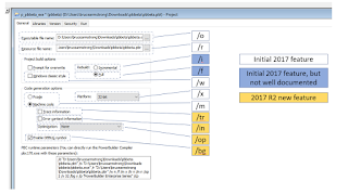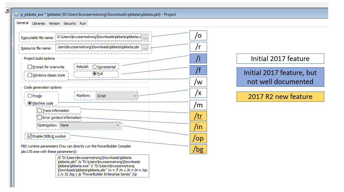 As you can see, PowerBuilder 2017 R2 adds support for every option on the General tab that wasn't previously supported, with the exception of "Prompt for overwrite" which wouldn't make sense for a command line compiler. One note with regard to the /i and /f options. Those were available in the initial release, but they weren't included in the documentation that came with the compiler (the PBC170.PDF file). In fact, they aren't documented in the R2 version of that file either. It does show up in the "PBC runtime parameters" when you toggle the option though, so if you were using that to get the arguments to provide to the compiler you were getting what you needed. They are also documented in the command line help you get if you run the compiler with the /h option. This documentation laspse has been reported to Appeon and should be addressed in a later update.