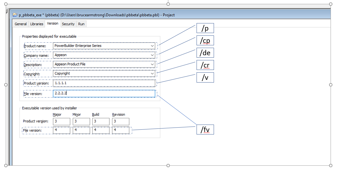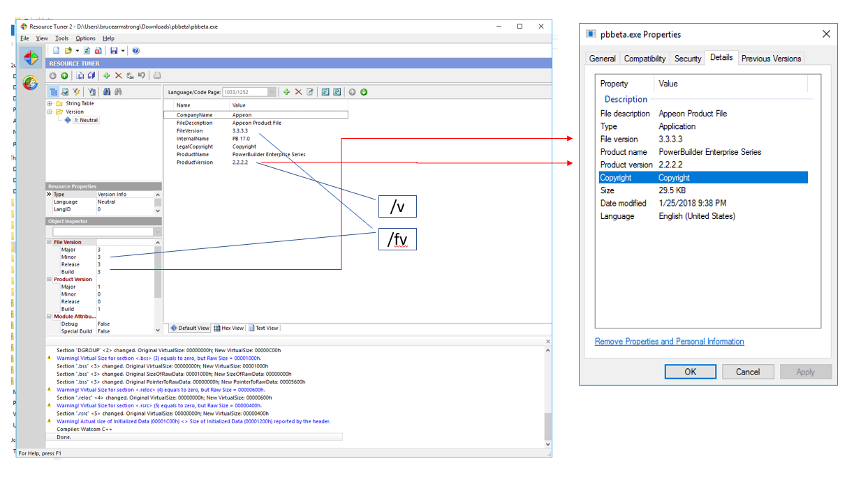 It's actually a common practice to set the ProductVersion and FileVersion string values to string representations of the PRODUCTVERSION and FILEVERSION numeric values. If that's what you do, then that second issue really isn't of concern. However, the Windows installer uses the PRODUCTVERSION in the 'fixed-info' section, so it can be important to be able to set that. These issues have been reported to Appeon and are under consideration to be addressed in a later release. Until then, if you want to use the command line compiler but the way it handles version information is an issue for you, you might consider the Version Edit utility from E Crane. It's a command line tool that properly handles the version stamping PowerBuilder executables.