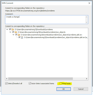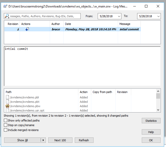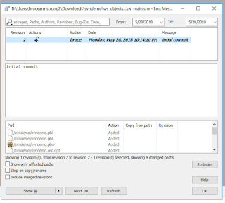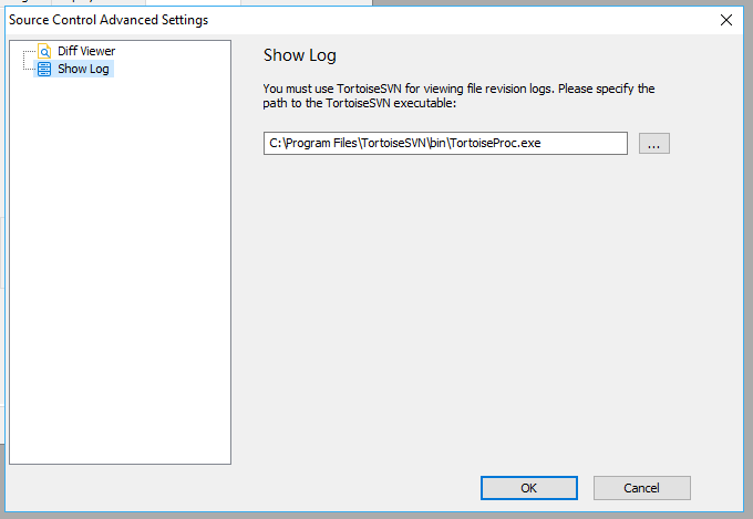 The second option (Show Log) is where you specify the location of the TortoiseSVN executable so that it can be used to when you select the Show Log option in the PowerBuilder menu. There's no option here, TortoiseSVN is the only choice. Note that there are a lot of executables in the TortoiseSVN bin directory. You won't want the ones with "Diff" in their names, although that seems logical. The one you want is the TortoiseSvnProc.exe file. Finally, for both these options (Diff and Show Log) the bitness of the application doesn't matter. Since I'm using a 64 bit OS machine for the demo, I'm using the 64 bit version of TortoiseSvn, and PowerBuilder is calling it fine.