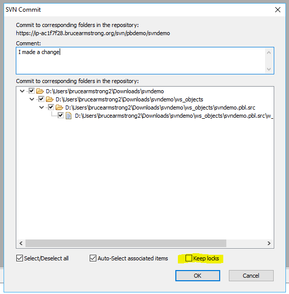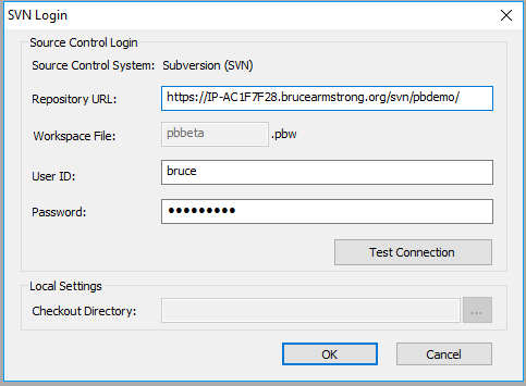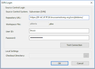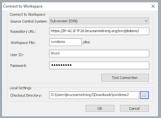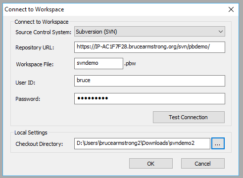 In R2, PowerBuilder forced you to create a remote repository that matched the workspace name. You then provided PowerBuilder with base URL for the SVN server and PowerBuilder constructed the repository URL by appending the workspace name to the base URL for the server. In R3 that limitation has been removed. Now when you do the initial connect to source control you simply provide the full repository URL we copied earlier.