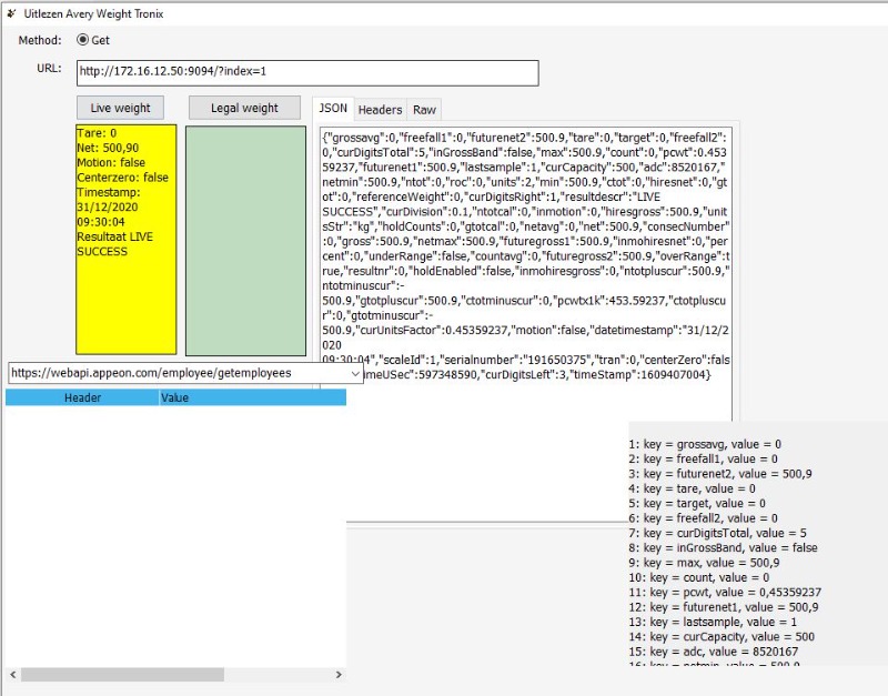 {"grossavg":0,"freefall1":0,"futurenet2":500.9,"tare":0,"target":0,"freefall2":0,"curDigitsTotal":5,"inGrossBand":false,"max":500.9,"count":0,"pcwt":0.45359237,"futurenet1":500.9,"lastsample":1,"curCapacity":500,"adc":8520167,"netmin":500.9,"ntot":0,"roc":0,"units":2,"min":500.9,"ctot":0,"hiresnet":0,"gtot":0,"referenceWeight":0,"curDigitsRight":1,"resultdescr":"LIVE SUCCESS","curDivision":0.1,"ntotcal":0,"inmotion":0,"hiresgross":500.9,"unitsStr":"kg","holdCounts":0,"gtotcal":0,"netavg":0,"net":500.9,"consecNumber":0,"gross":500.9,"netmax":500.9,"futuregross1":500.9,"inmohiresnet":0,"percent":0,"underRange":false,"countavg":0,"futuregross2":500.9,"overRange":true,"resultnr":0,"holdEnabled":false,"inmohiresgross":0,"ntotpluscur":500.9,"ntotminuscur":-500.9,"gtotpluscur":500.9,"ctotminuscur":0,"pcwtx1k":453.59237,"ctotpluscur":0,"gtotminuscur":-500.9,"curUnitsFactor":0.45359237,"motion":false,"datetimestamp":"18/12/2020 15:41:06","scaleId":1,"serialnumber":"191650375","tran":0,"centerZero":false,"adcTimeUSec":2648610,"curDigitsLeft":3,"timeStamp":1608306066}