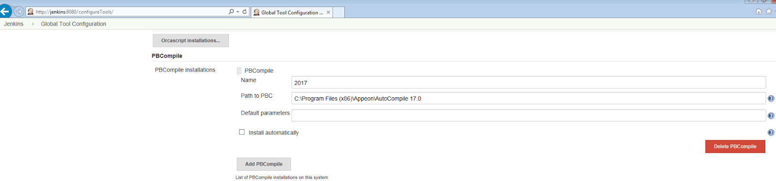 Scroll down the page a bit more and you will see a new "PBCompile" section. Select the "Add PBCompile" button as before. In the form that appears,provide the installation with a name and the path to the PowerBuilder command line compiler (pbc170.exe or pb190.exe).