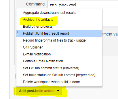 The first thing we're going to do is to tell Jenkins to archive off the EXE and PBDs (Jenkins calls them "artifacts"). To do this, create a Post Build step and select "Archive the Artifacts"
