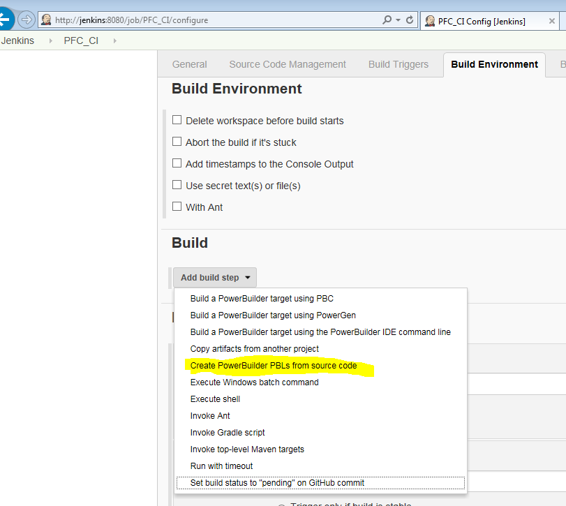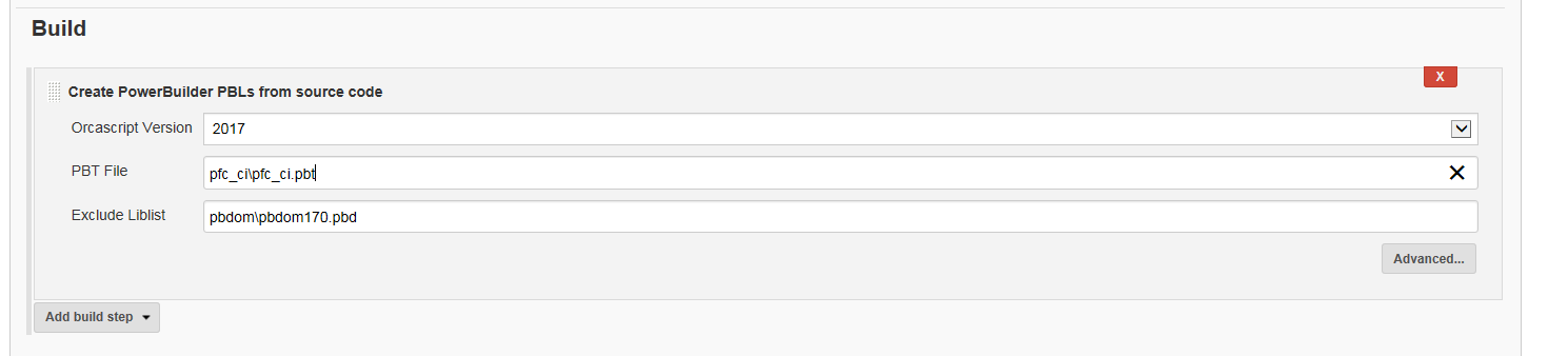 Delete all the previous build steps that called batch files. Now add a new one and notice a new entitled "Create PowerBuilder PBLs from source code". Select that one.