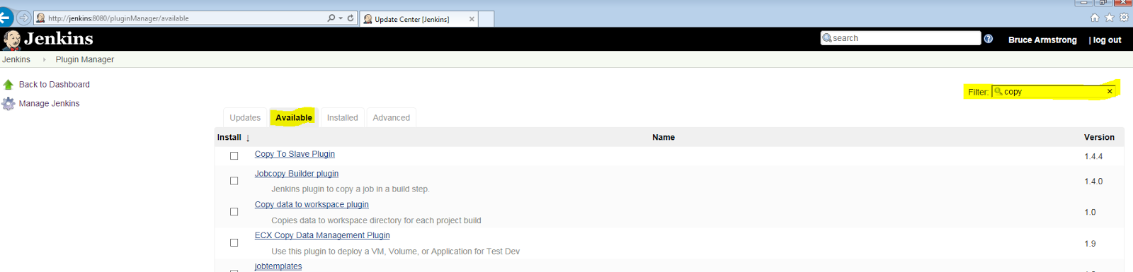 Now that we have the PBDs and EXE in the archive location, we want to use the Copy Artifacts Plugin to copy them to the build folder. First we'll need to install the plugin. Go back to the Manage Jenkins -> Manage Plugins page, but this time select the "Available" tab. Because there are a lot of plugins for Jenkins you might want to use the Filter option in the upper right to pear down the list.