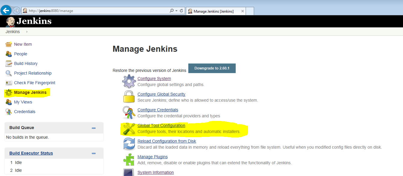 After the server has been restarted go back into "Manage Jenkins" and then "Global Tool Configuration".