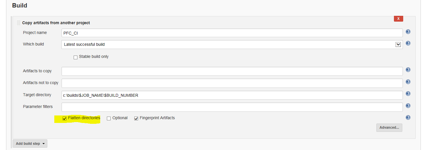 - Target Directory: The he location you want the files copied to, and can reference the Jenkins environmental variables using $VARIABLENAME (as opposed to %VARIABLENAME% that we used in the batch files). For example, I'm using: