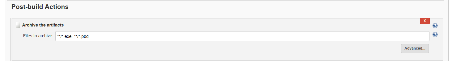 The syntax is Apache Ant include fileset. This particular setting tells Jenkins to find all of the EXE and PBD files in the workspace - including in any subdirectories - and copy them into the archive location. When it does so it preserves the subdirectory structure, something we'll deal with in the next step.