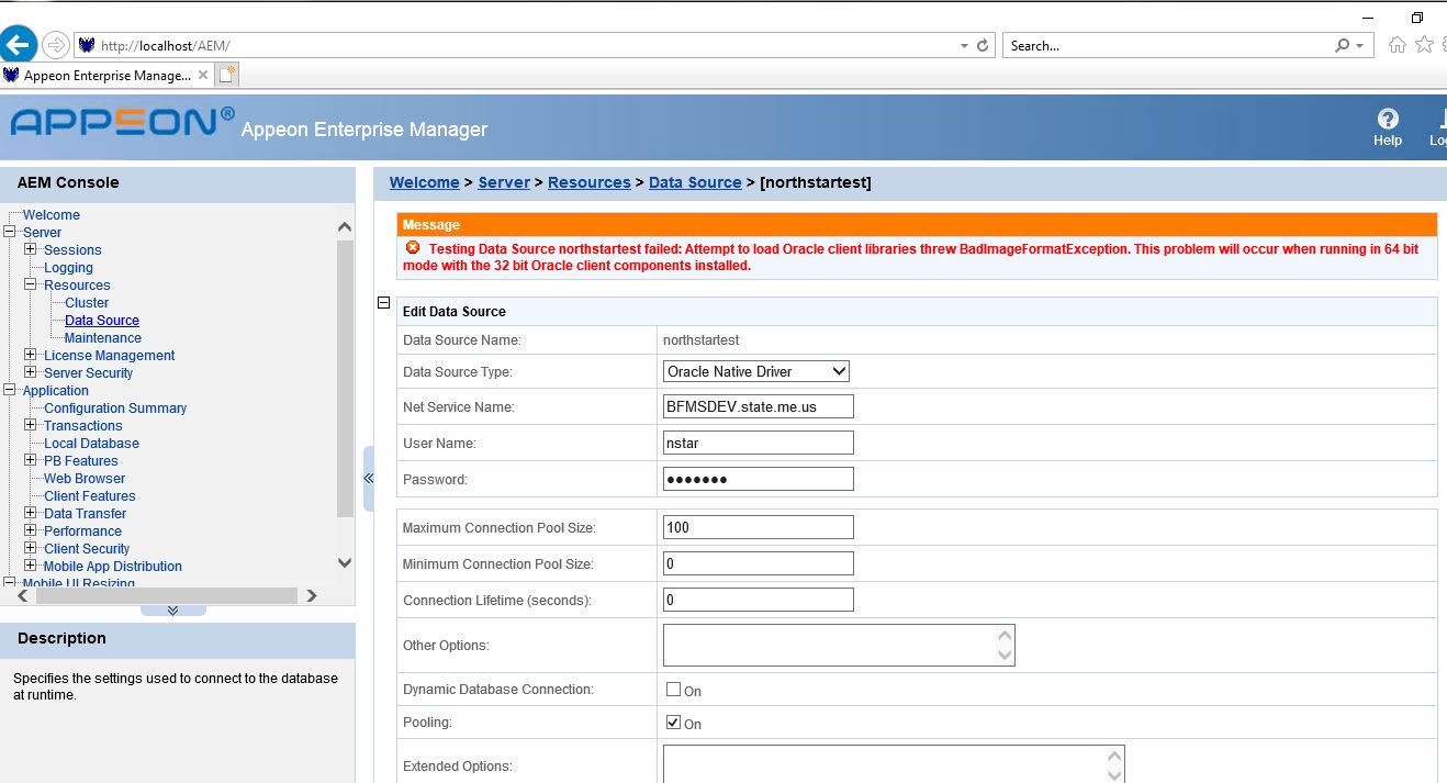 I have a problem configuring Appeon enterprise manager(AEM) for converting into web. I was not able to connect to an oracle native driver or an ODBC. Its says "Problem occurred when running in 64 bit mode with the 32 bit oracle component installed". I have not been asked for the type(32 -bit or 64 -bit) while installing power server. Yet i face this issue. Can anyone provide me work around please?