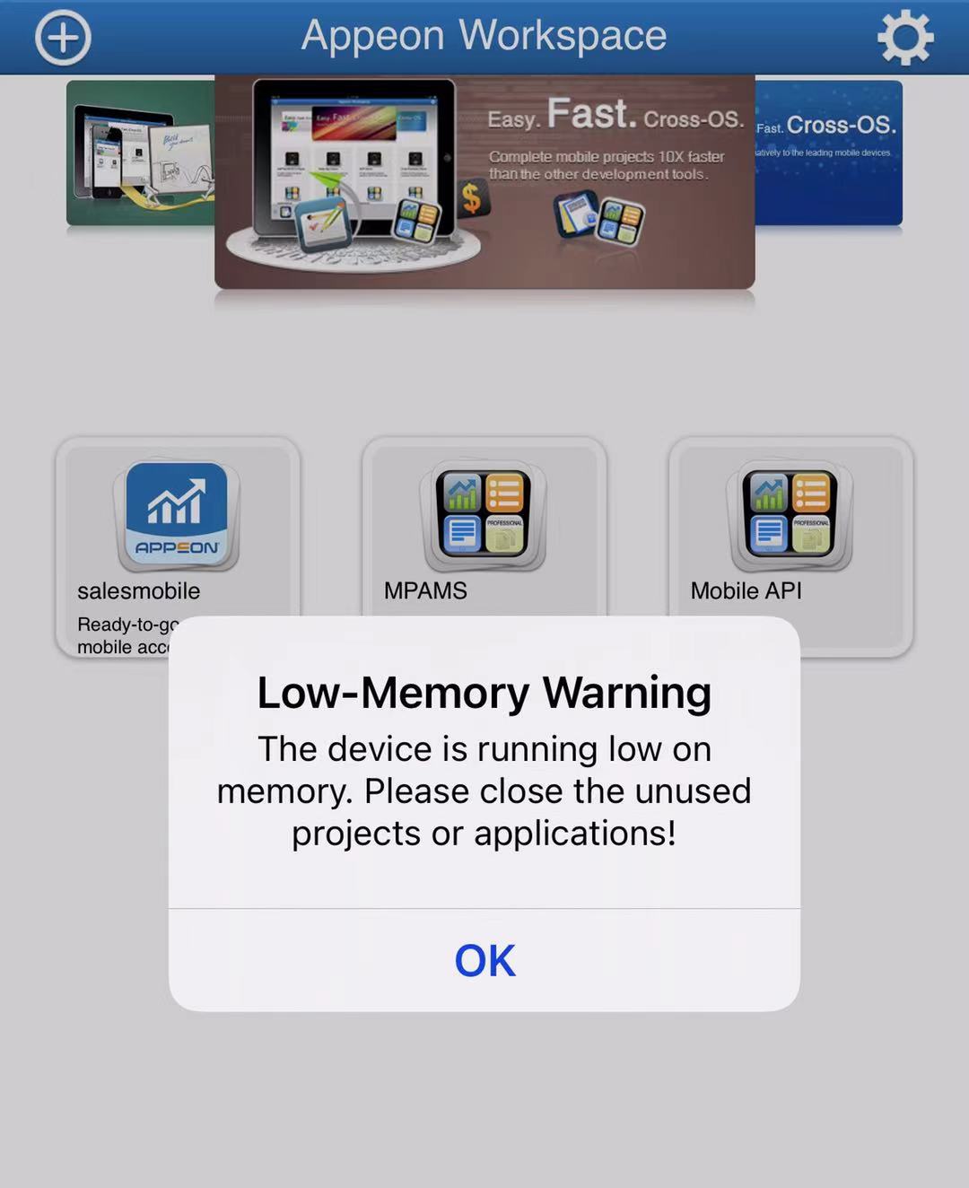 My Appeon Workspace always prompt "Low-Memory Warning" in iPhone and Android Phone, is there any solution? Thank you.