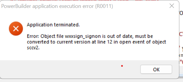 Getting error (attached) when running the Application after doing Full Incremental Build of Code in PowerBuilder 2019 Build 2170. Kindly suggest on this.