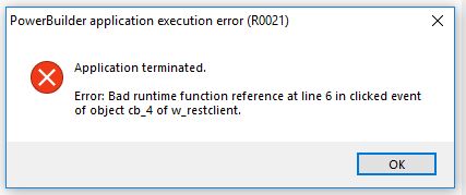 I am using Powerbuilder classic 2017R2 build 1769(32 bit) and windows 10. I am not able to use c++ dll in my application. I got runtime error as "R021 - Bad runtime function reference".