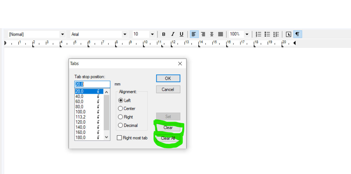 Hi! Is there any function to clear tabs in richtext control? Do we have this functionality only when we double-click on the ruler of the richtext control?