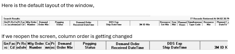 Column order keeps changing in Datawindow every time we open the window. We cleared the registry entry of this window and logged in to the application and opened the screen, it displays the column in correct order. And soon close the screen and reopen, all columns and data jump around. This issue started to happen after we migrated our powerbuilder application from 12.6 to 2019 R3 version. Could you please shed some light on this issue?