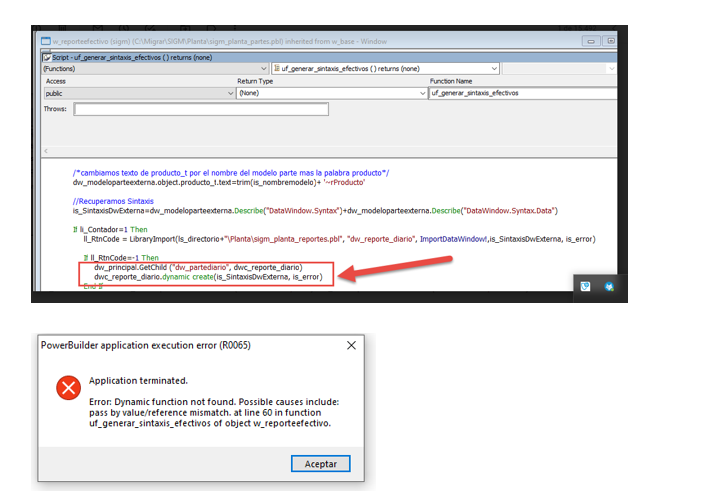 Cuando utilizo la funcion Dynamic Create en el datawindowChilld en powerserver me duevuelve un mensaje de error, en PB si funciona.