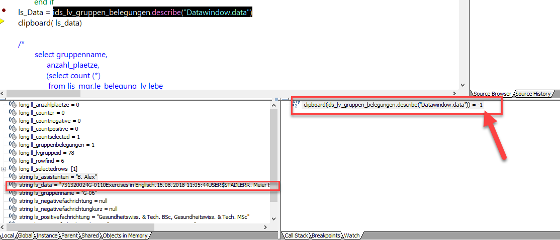 It's some time ago (PB 9 or 10)... It was possible to put the data of a datastore/datawindow into a clipboard during the debug-modus using a statement like this in the watch tab: