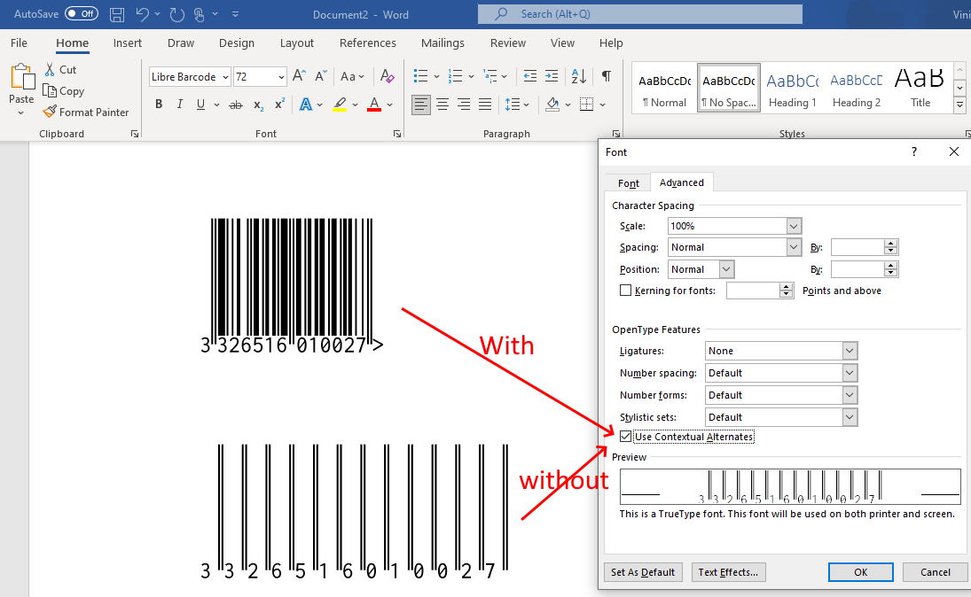 I am trying to create datawindow labels with EAN-13 barcode using OpenType fonts as Libre Barcode EAN13 Text from google, but for some reason this kind of font demands enable special feature such as on MSWord "Fonts / Advanced / Contextual Alternates" (attached image for reference)