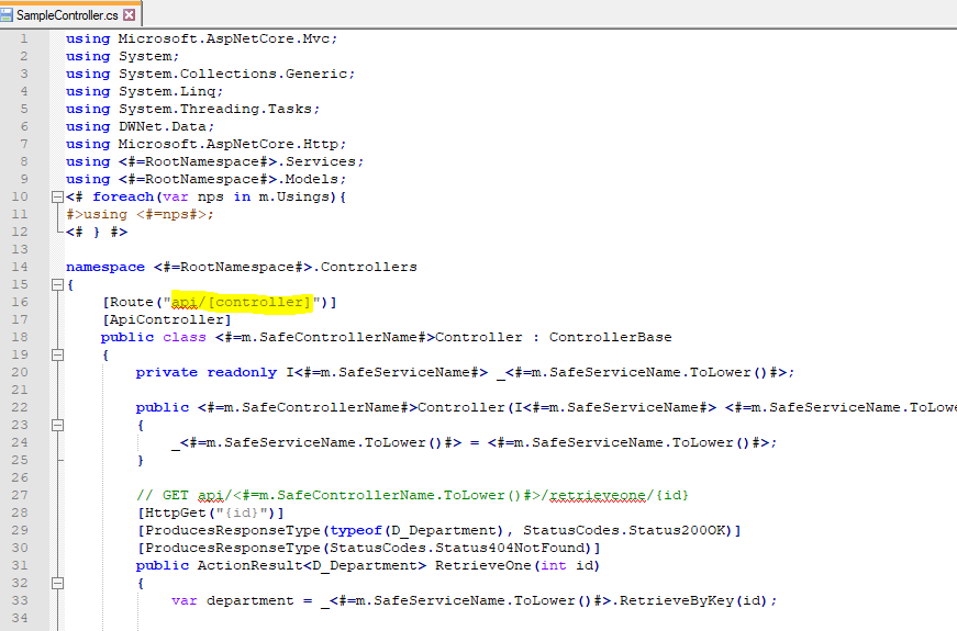 But if i modify and save this "SampleService.cs" it does not have any effect on the code generated by the scaffolding and i still get the /[action] routing argument (screenshot03).