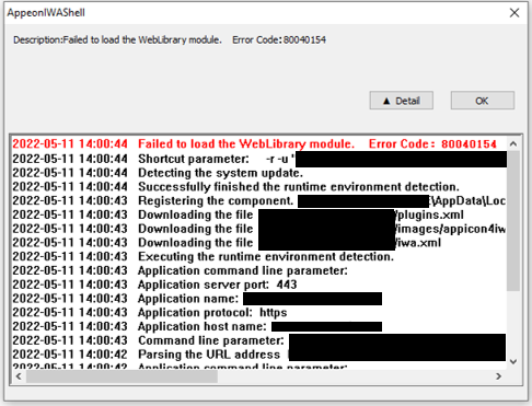 He gets the error 'Failed to load the WebLibrary module. Error Code: 80040154' and title AppeonIWAShell