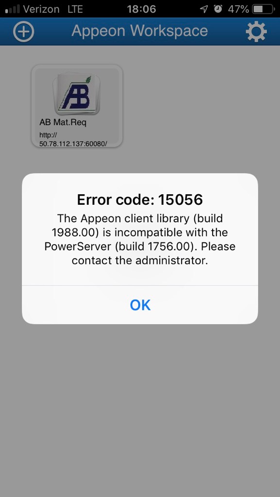 One of my user recently change his I-phone (8) with IOs 12.1.4 and he had to reinstall Appeon WorkSpace. We installed the app and now he is getting the following error:
