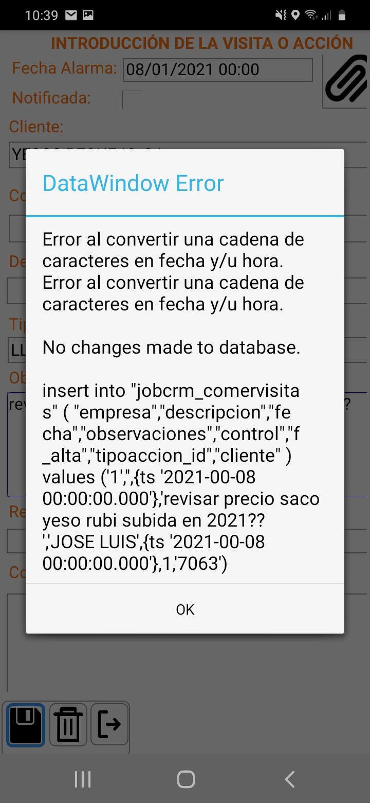 I have a field in a datetime type datawindow with mask: dd-mm-yyyy hh: mm and when the update of the datawindow is done it gives the error of the image.