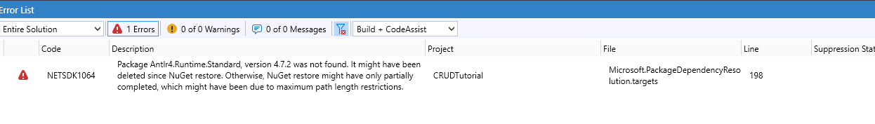 Package Antlr4.Runtime.Standard, version 4.7.2 was not found. It might have been deleted since NuGet restore. Otherwise, NuGet restore might have only partially completed, which might have been due to maximum path length restrictions.