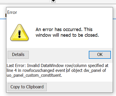 Last Error: Invalid DataWindow row/column specified at line 4 in rowfocuschanged event of object dw_panel of uo_panel_custom_constituent.