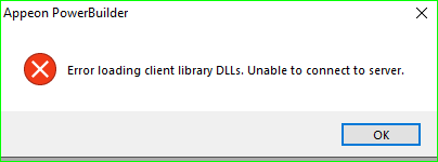 Trying to connect database in powerbuilder 2019 using database profile but it's throwing error as "Error loading client library DLLs. Unable to connect to server".