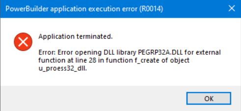 I am getting this error : Error opening DLL library PEGRP32A.DLL for external function at line 28 in function f_create of object u_process32_dll.