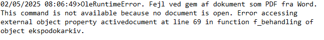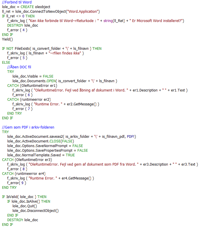 Error comes when program try to save the pdf, like this: lole_doc.ActiveDocument.saveas2( is_arkiv_folder + '\' + is_filnavn_pdf, PDF!)