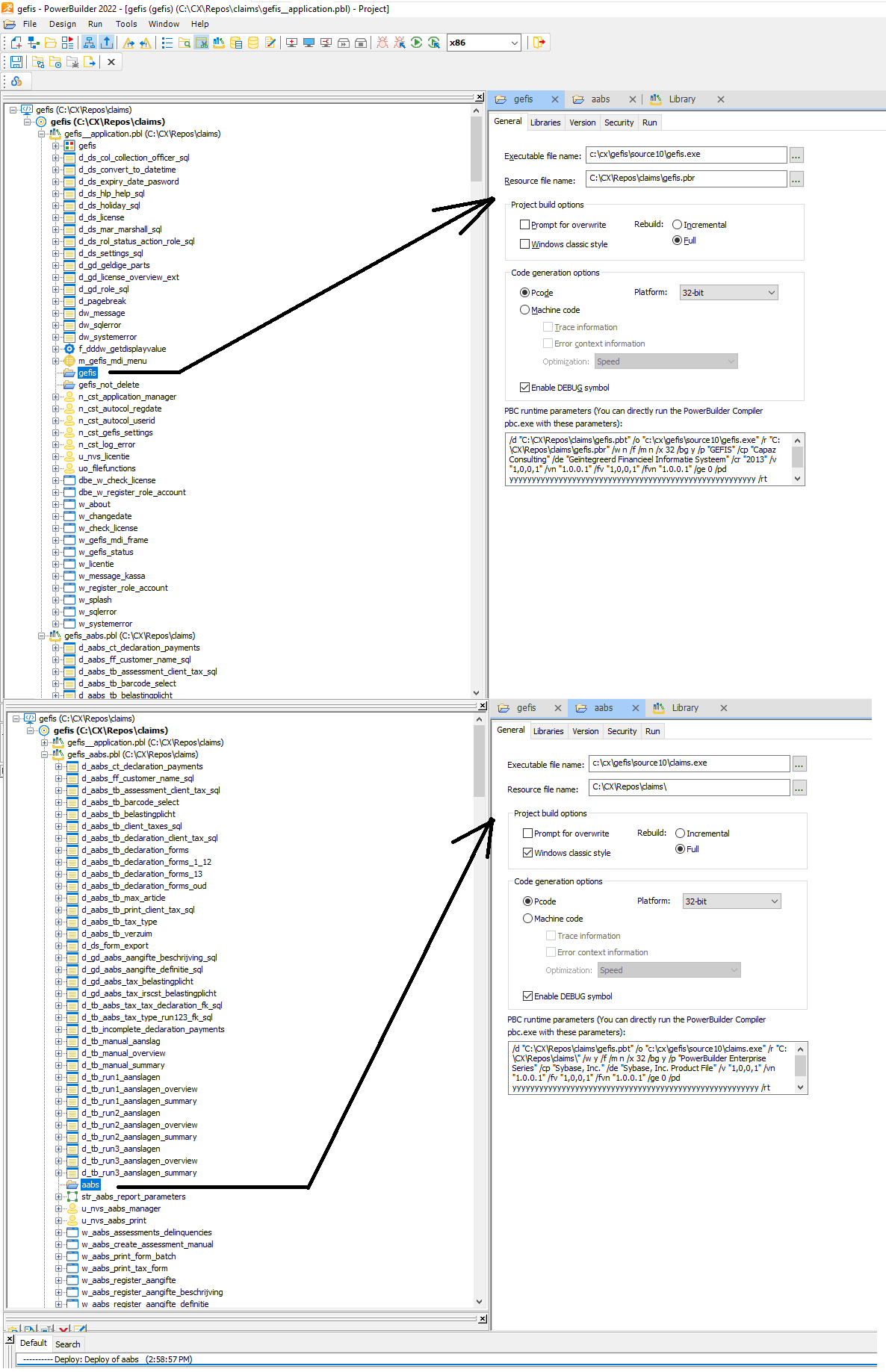 Hello, I have two executables that are part of the same project, here I share the images of the structure of my project, I have the main project which is gefis__application, and I have a second dependent project, whose executable name is: "Claims". It turns out that this is a project that I need to migrate to PB22, and it comes from PB10, but what I can't do is do a correct deploy to the claims subproject, because it gives me the following error " ---------- Deploy: Deploy of aabs (2:58:57 PM)