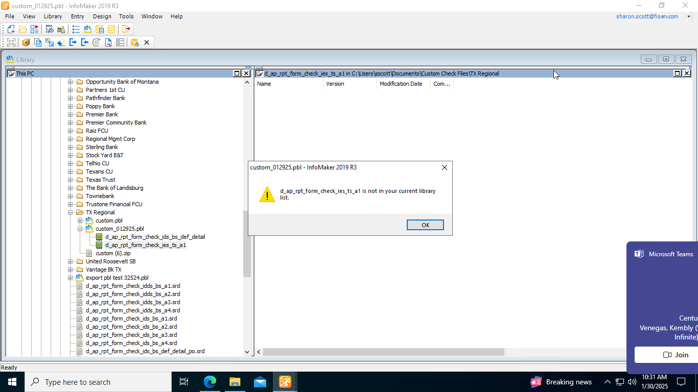 I've been using InfoMaker for years & had just used it last week. I'm not understanding why I'm continually receiving this error, when the specified form was selected in my library (see attachments). Could someone please direct me on how to resolve this error, as I have several clients that are waiting for changes to their custom check PBL files?