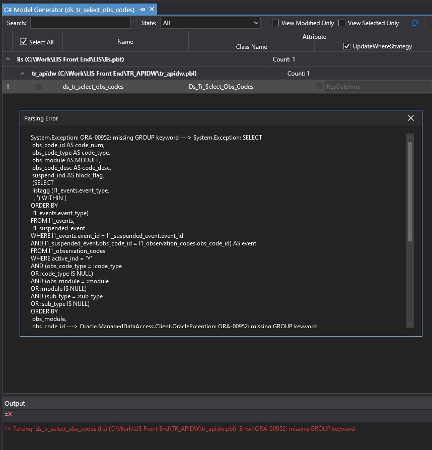 I'm getting a parsing error in the C# model generator for a datawindow that I am not sure how to resolve -- see attached. The datawindow works fine in PB when doing a preview and passing the required arguments. The issue appears to related to a subselect where I use the Oracle LISTAGG function to combine multiple values in a comma delimited string. Is there a way to adjust the SELECT statement so that it can be exported to my web api?