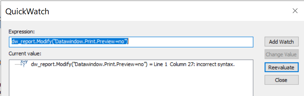 To troubleshoot this issue, I attempted to modify the print preview of DataWindow dw_1 using dw_1.Modify("DataWindow.Print.PrintPreview = No"). However, while executing this line of script, I encountered an error: "Error at Line 1, Column 27: Incorrect Syntax" in Quick Watch.