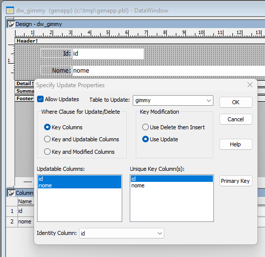 e successivamente un breve applicativo che sfrutta l'identity nella datawindow ( vedi immagine ).