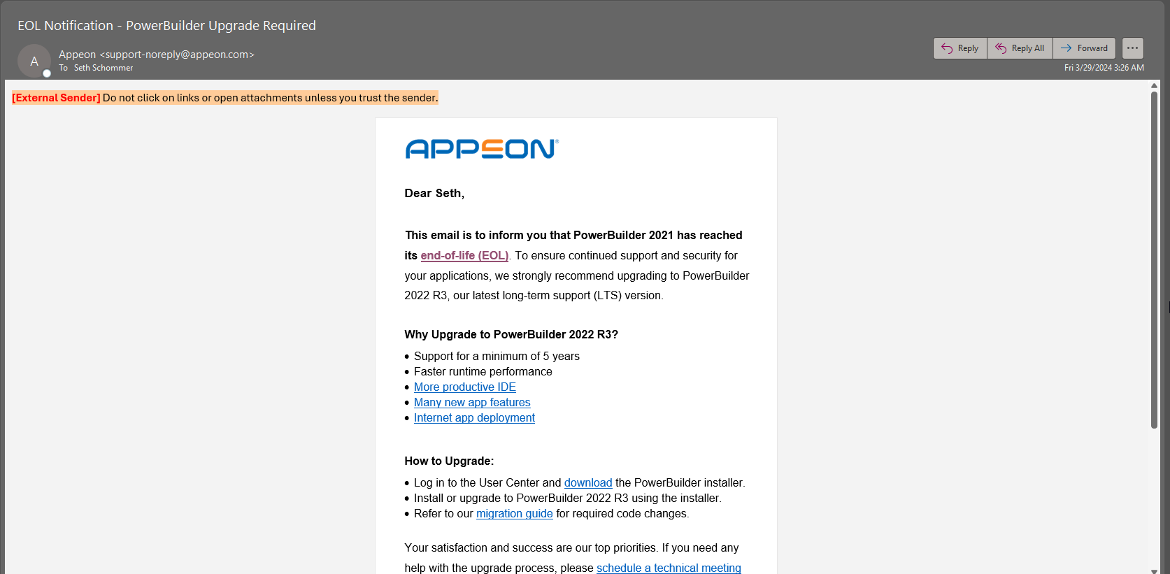 Why did I receive an EOL notification email (screenshot attached) regarding PowerBuilder 2021? The Product Availability Matrix indicates that 2021 won't reach EOL until 2024.09.04.