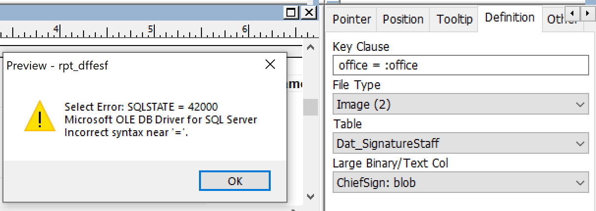 A pop error message appears" SQLSTATE 42000 microsoft ole db driver for sql server incorrect syntax error near "=". "