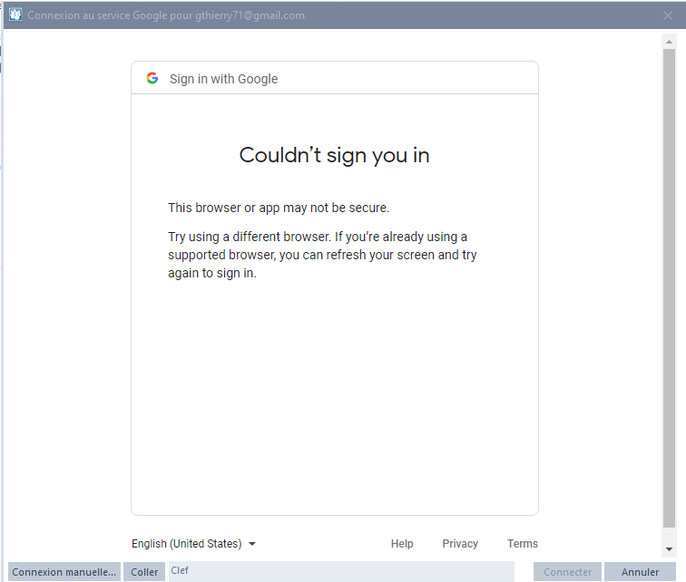 Google seems not to recognize the web browser and is blocking authentication with this error :