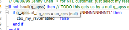 You can see the code there is supposed to be guarding the dereferencing of g_apss.uf_(something hidden) by having an "if not isnull(g_apss)" first ... and you can see by the value shown by the hover that g_apss is actually null. HOWEVER I keep getting a null object reference because it goes right through to try to dereference g_apss.