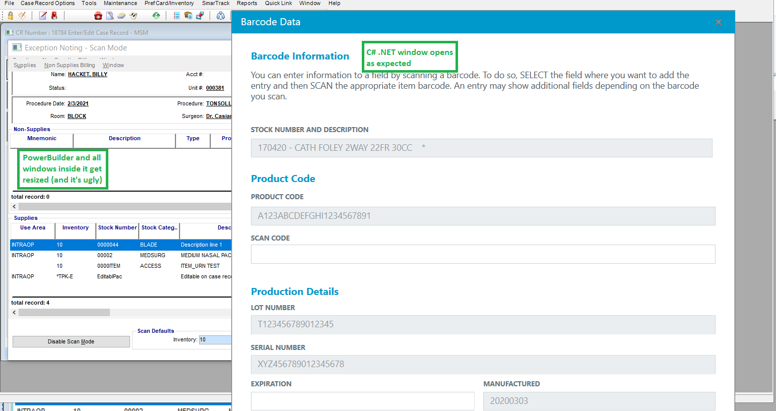 PROBLEM: when I run my app in PB and call this function, the C# .NET window opens with the arguments populating its fields. But as it opens, PB resizes itself - the app is resized (but not all the objects within the app), and when I close the app and return to PB, PB itself is resized, and looks silly. The only way to get PB back to normal is to close and restart it.