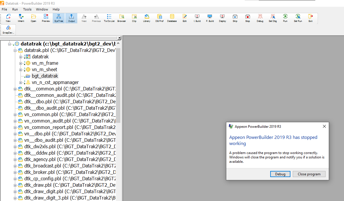 I am running PB 2019 R3 on a Windows 10 OS. Until yesterday things seemed fine. Seemingly, out of nowhere, yesterday I could no long run my application from the IDE. After clicking on the Run item the IDE/application seemed to hang until I killed the process. Now the IDE crashes each time that I exit the IDE as well. I have attached a screenshot of the crash when exiting the IDE.