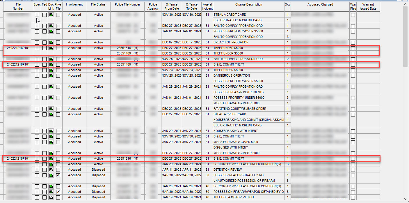 The results are displayed and sorted by File Number, Incident Number, Police Agency, Incident From Date, Incident To Date and Charge Description.