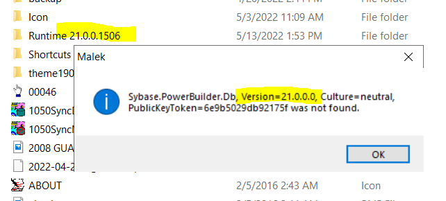 When i execute the executable from my local machine that has Powerbuilder installed, it works as expected. However when i ran the app (same executable folder) from a machine that does not have powerbuilder it failed to connect to the database. The 2019 compiled version works fine on all machines but the 2021 build does not. I added a message box after the call to the connection function to return SQLErrText the message is attached.