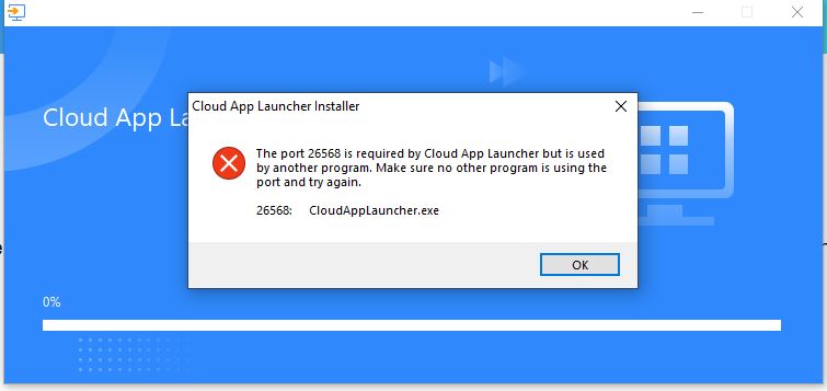 When i call the application through the browser, it's successfully download the CloudAppLauncher to the local drive and when i try to install the same i am getting the port number error. Please find the below attached screenshot for your reference.