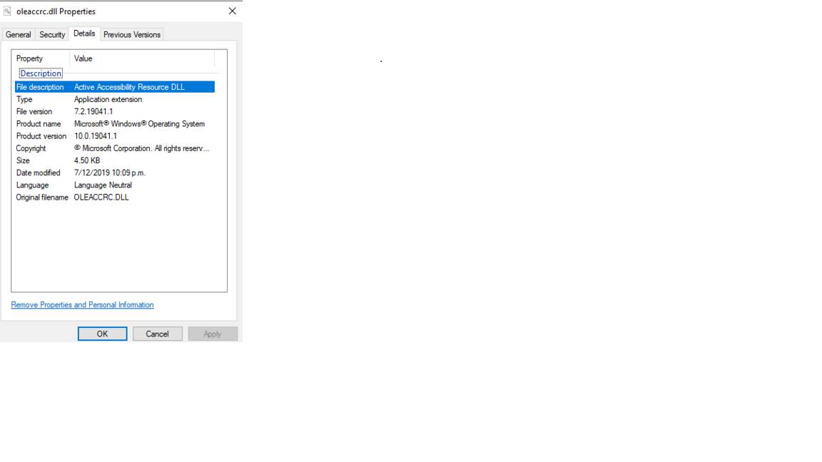 I have an image of the windows log attached and also the version of the OLEACC.dll.